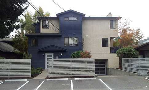 Our renovations included a new building facade for better street appeal and renovating the six townhouse units. We painted the existing wood siding, revised the front canopy and added a new contemporary front and garage door. Improved landscaping and a new privacy fence were used to soften the front facade. The interiors were improved with new LVT hard surface flooring, kitchen cabinet modifications, new appliances, paint, water saving fixtures, LED lighting and new 3' base trim.